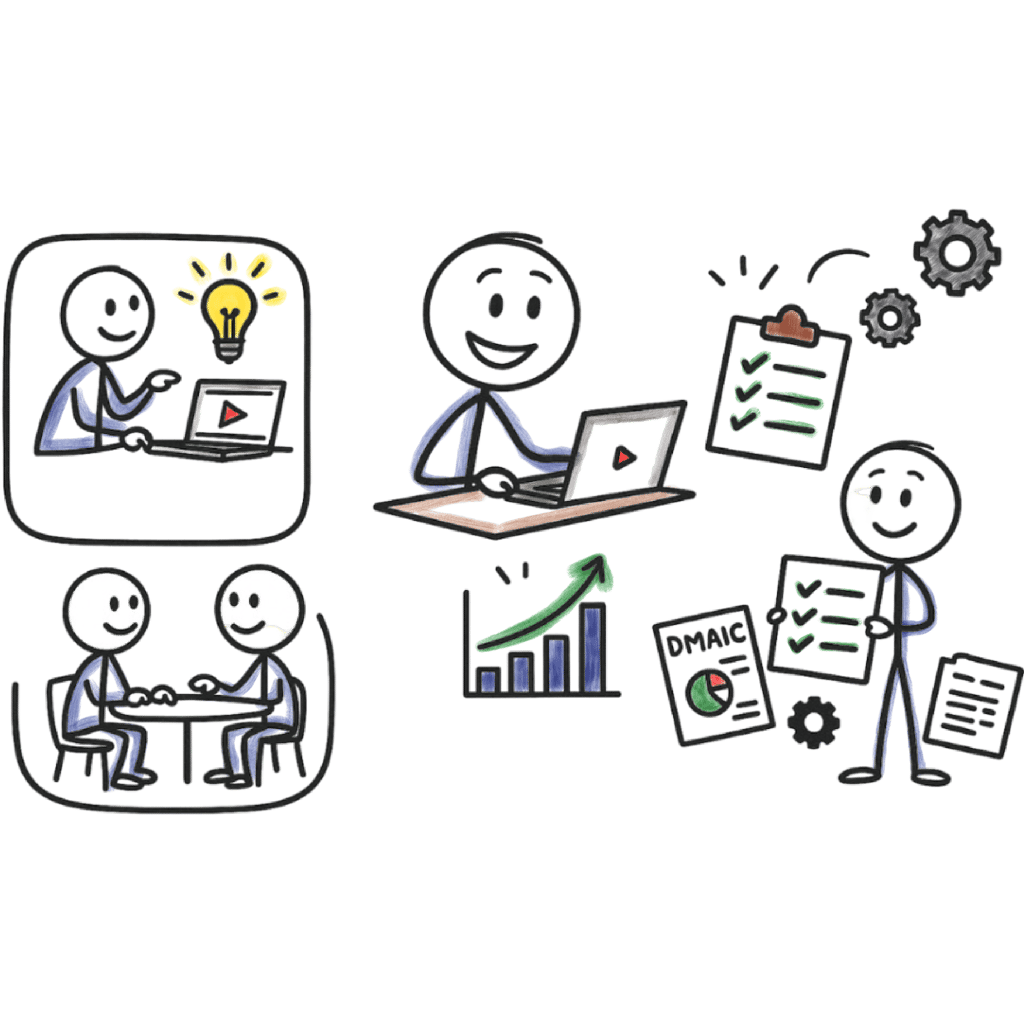 Lernen & Anwenden: Schritt-für-Schritt-Kurse mit echten Praxisbeispielen, die dir zeigen, wie Lean Six Sigma, Projekt Management und Führung im Change Management in der Realität funktioniert.