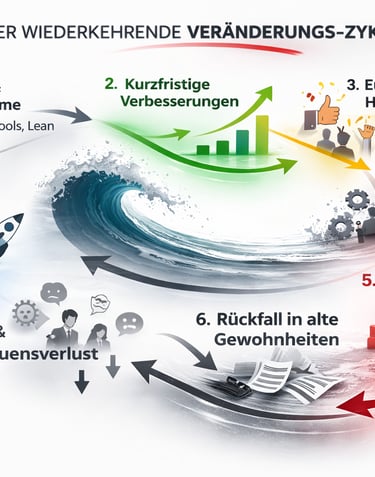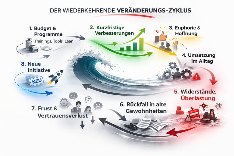 Ergebnisse werden kurzfristig besser, und später kehrt der Alltag zurück. Teams werden müde, das Vertrauen sinkt, und die nächste Initiative fühlt sich an wie die nächste Welle.